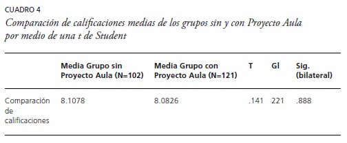 Para valorar los resultados de la aplicación de Proyecto Aula en términos de rendimiento académico de los estudiantes en la EE de MIC, se hace una comparación entre las calificaciones medias de los grupos sin y con Proyecto Aula, a través de una prueba t de Student para muestras independientes,7 con un nivel de confianza de .05. Como muestra el cuadro 4 no existen diferencias estadísticamente significativas en el rendimiento académico entre ambos grupos.