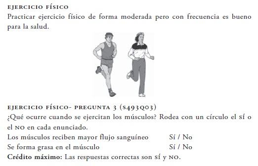 La pregunta requiere meramente reconocer hechos que son independientes entre sí, tales como que los músculos al ejercitarse reciben o no mayor flujo sanguíneo y si el ejercicio físico favorece o no la formación de grasas. Es evidente que en este caso la cantidad de información es mucho menor que en el ejemplo de nivel 2. La solución del problema se reduce a establecer una conexión directa entre el conocimiento y la pregunta. No es necesario que el alumno realice los pasos de aproximación progresiva a las respuestas que le requirió la pregunta de nivel básico. Para estar en condiciones de resolver aquella pregunta fue necesario establecer una relación entre un hecho químico y una ley general, pero para ello fue imprescindible saber que lo que le pasa a las cariátides se puede observar experimentalmente colocando una esquirla de mármol en vinagre, puesto que el efecto del vinagre sobre el mármol es equivalente a la reacción que produce la lluvia ácida y que como resultado de ello se forman burbujas de gas. Fue recién a partir de ese punto donde comenzaron a importar los conocimientos químicos: que las burbujas de gas implican pérdida de masa. En cambio, para lograr ubicarse en el nivel 1, los alumnos sólo debieron recordar que los músculos al ejercitarse reciben mayor flujo sanguíneo y que el ejercicio físico disminuye la formación de grasa, conocimientos aplicables por separado, de manera aislada. Tal es lo que aconteció con el 32.8% de nuestros estudiantes que obtuvieron entre 334.9 y 409.5 puntos.