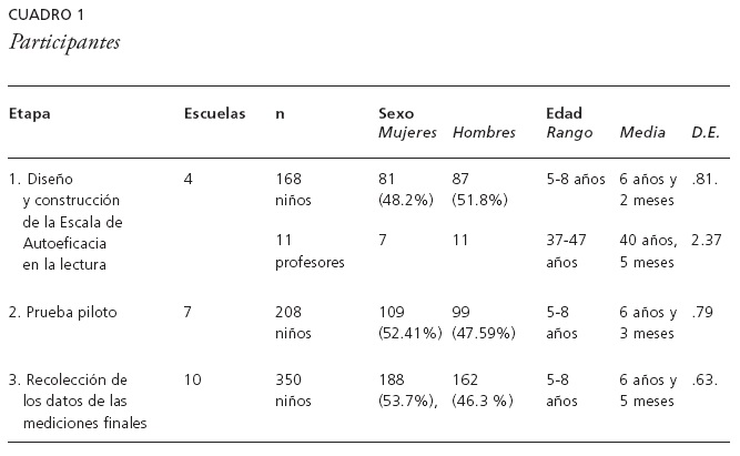 Se emplearon dos tipos de muestreo. Para las etapas 1 y 2 -diseño y construcción de la escala de autoeficacia en la lectura y prueba piloto- se utilizó uno no probabilístico intencional (Clark, 2002). En la etapa 3 -recolección de los datos de las mediciones finales- se usó un muestreo probabilístico por conglomerados multietápico (Clark, 2002). El muestreo se realizó tomando como base el sistema de organización administrativa para el nivel de educación primaria de la Secretaría de Educación del estado de Yucatán, el cual se divide en nueve sectores escolares que contienen de nueve a once zonas de supervisión, las cuales a su vez contienen de 18 a 20 escuelas. Se seleccionaron al azar tres de los nueve sectores, y de ellos 10 zonas de supervisión; de éstas se eligieron aleatoriamente tres y, finalmente, de estas tres se escogieron 10 escuelas.
