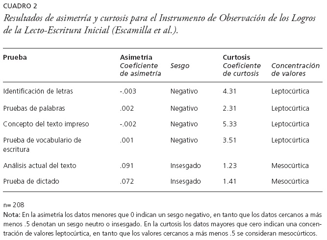 Para el Instrumento de Observación de los Logros de la Lecto-Escritura Inicial (Escamilla et al., 1996) se utilizó un análisis de curtosis con el fin de conocer cuáles eran las pruebas que aportaban información pertinente al objetivo planteado. Los datos fueron procesados en el paquete estadístico Pasw 19 versión 1.9.