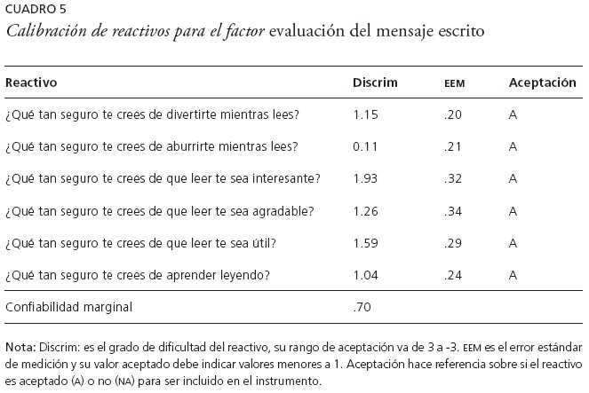 Con referencia al factor nombrado evaluación del mensaje escrito, no se eliminó ningún reactivo. Finalmente los resultados de la confiabilidad marginal de este factor presentan un coeficiente alto (.70).