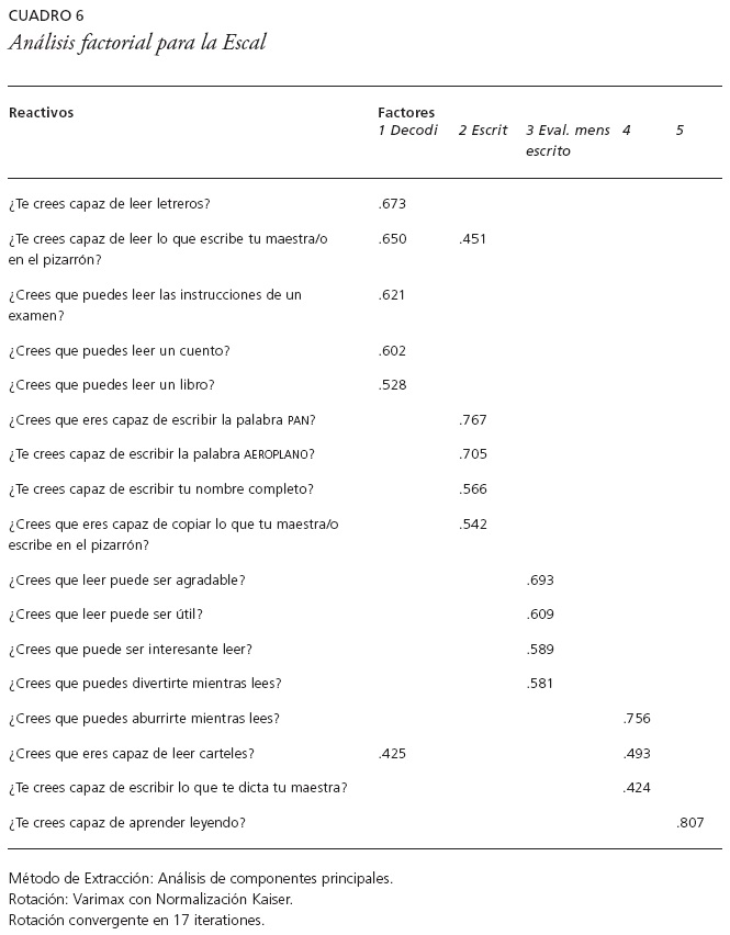 Los datos obtenidos coinciden en parte con la construcción teórica del instrumento, se encontraron los tres factores, decodificación, escritura y evaluación del mensaje escrito. Sin embargo aparecen cuatro indicadores que no mantienen coherencia teórica, tomando en cuenta los valores encontrados se sugiere, por una parte, mantener los indicadores ¿Crees que puedes aburrirte mientras lees? (.756) y ¿Te crees capaz de aprender leyendo? (.807) y, por otra, eliminar los indicadores ¿Crees que eres capaz de leer carteles? (.493) y ¿Te crees capaz de escribir lo que te dicta tu maestra? (.424).