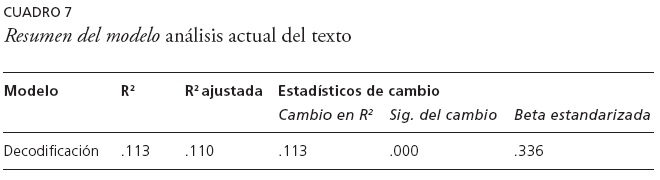 Para el factor Análisis actual del texto del comportamiento lector se obtiene como predictor el factor Decodificación, explicando 11% de la varianza (R2 ajustada = .110). Los coeficientes de regresión estandarizados (B = .336, p = .000), indican que, al incrementarse en una unidad el puntaje de la Decodificación, se incrementa en .336 el puntaje del Análisis actual del texto. El valor que se obtuvo para la constante fue de 29.9, esto es, lo que valdría la variable dependiente cuando la independiente vale cero. Es decir la creencia de los niños de que son capaces de recuperar significados de un texto, oración o palabra, escritos en diversos géneros, formatos y contextos predice el aumento en los puntajes del análisis actual del texto.