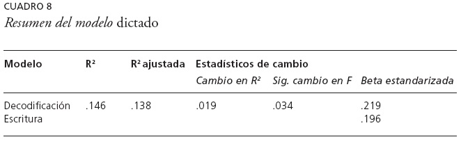 En el cuadro 8 se observa que las variables que cumplieron los requisitos para ser incluidas en el modelo fueron Decodificación y Escritura, explicando ambas 13.8% de la varianza en el puntaje del Dictado (R2 ajustada = .138). Los coeficientes de regresión estandarizados (B = .219, p = .000), indican que al incrementarse en una unidad el puntaje de la decodificación y la escritura, se incrementa en .219 el puntaje del dictado. El valor que se obtuvo para la constante fue de 13.50, esto es, lo que valdría la variable dependiente cuando las independientes valen cero. Esto significa que las creencias de los niños en su capacidad para recuperar significados de un texto, oración o palabra, escritos en diversos géneros, formatos y contextos, así como para reproducir y generar mensajes escritos, predice el aumento en los puntajes del dictado.