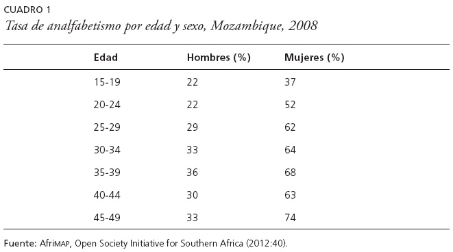 Pasados casi cien años, la educación de las mujeres aún es un capítulo pendiente si tenemos en cuenta que 38% de las niñas con edad para ingresar en la escuela no están matriculadas (Instituto Nacional de Estadísticas de Mozambique, 2009). Veamos también en el cuadro 1 que, según aumenta la edad, es mayor el analfabetismo entre las mujeres.