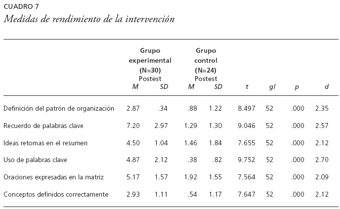 Se realizó un análisis de muestras independientes solamente post-test para dar cuenta del rendimiento en las diversas medidas de la intervención. Los resultados, tal como muestra el cuadro 7, señalan diferencias significativas en las distintas medidas para el grupo experimental; mientras que en el grupo control no se observaron. En términos generales los resultados muestran la habilidad de los alumnos para transferir su recién adquirido conocimiento de las estrategias a una situación de lectura ante contenidos conceptuales diferentes a los abordados en la intervención.