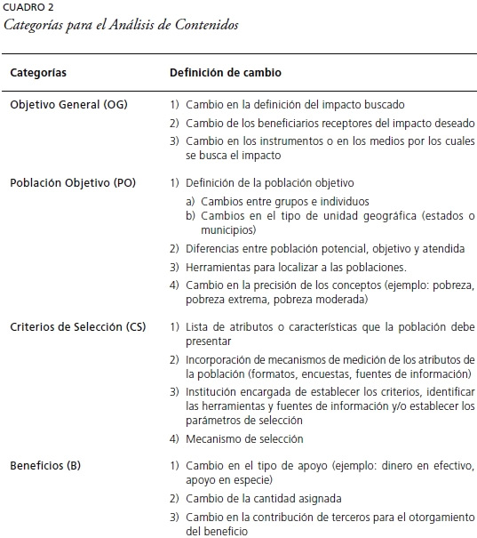 Para sistematizar toda la información de los 14 programas seleccionados, se realizó el análisis del contenido (PEMD, GAO, 1996). El objetivo era estudiar la vinculación entre los cambios en las reglas de operación y las evaluaciones para analizar las formas de influencia de la actividad evaluativa. Para este análisis se utilizaron las siguientes categorías: objetivo general, población objetivo, criterios de selección y tipo de beneficio. En el cuadro 2 se puede observar la definición de cambio en cada una de las categorías de análisis.