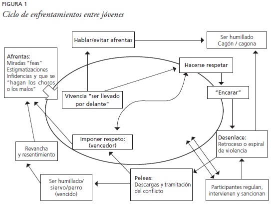 En la figura 1 se reconstruyen las vías de acción de los jóvenes en los enfrentamientos vistos como procesos de decisión condicionados por ciertas pautas grupales y argumentos justificativos. El comienzo de las peleas se asocia casi siempre a miradas provocativas, burlas y comentarios insidiosos o insultos explícitos interpretados como afrentas al respeto personal. Pero si alguien "se hace el choro" o "la humienta" es muy difícil no hacer frente a la ofensa. Los jóvenes señalan que el sentir que "te quieren llevar por delante" es entendido como el punto de inicio de un conjunto de acciones destinadas a evitar el atropello personal.