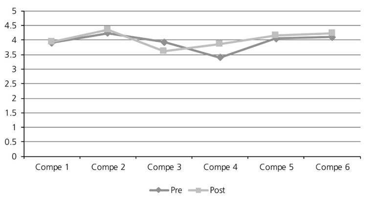 De forma general, los datos obtenidos en el cuestionario pos-test son más elevados. Por ello, el desempeño profesional en formación ha permitido al alumnado adquirir las competencias generales y superar las expectativas iniciales. No ocurre lo mismo en la competencia 3, relacionada con la Capacidad creativa y emprendedora, actitud innovadora y de adaptación al cambio, tal como se observa en la figura 1, donde la valoración una vez finalizadas las prácticas es menor a la realizada por el alumnado antes del comienzo de las mismas. En este sentido se han encontrado diferencias estadísticamente significativas (T= -2.08; p=0.037). Durante el periodo de prácticas institucionales, el alumnado tenía la idea de adquirir la competencia relacionada con la Capacidad creativa y emprendedora, actitud innovadora y de adaptación al cambio y, sin embargo, una vez finalizadas las prácticas, manifiesta no haber conseguido tan satisfactoriamente esa competencia.