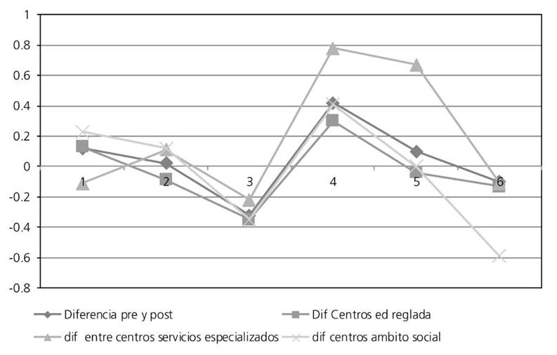 Si comparamos las diferencias en la aplicación pre y post de la muestra total con la distribuida en función de los tipos de centros de prácticas mencionados, se observa una diferencia positiva en las competencias 4 y 5 sobre Capacidad para valorar el impacto social y medioambiental de actuaciones y decisiones en el ámbito educativo y social y la capacidad de valorar, criticar y autocriticar (compromiso ético). Dicha diferencia se debe a la alta valoración otorgada en las competencias por los estudiantes cuando han realizado sus prácticas en centros de servicios especializados, es decir, los alumnos no pensaban adquirir estas competencias generales y, sin embargo, una vez finalizadas las prácticas, dicen haberlas conseguido. Por su parte, en la competencia 3, Capacidad para valorar el impacto social y las decisiones en el ámbito educativo, sucede lo contrario, pensaban haberla desarrollado y finalmente no ha sido así.