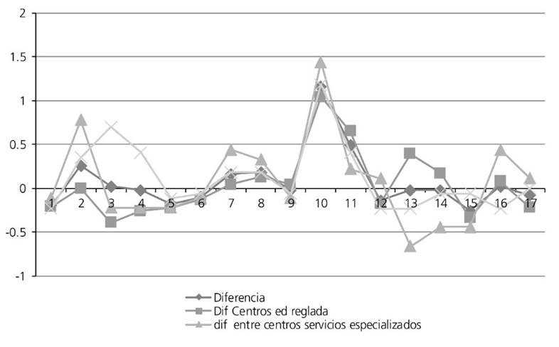 Si bien nuestro estudio está enfocado en recoger información acerca de la percepción de los estudiantes sobre su nivel de adquisición de competencias a lo largo de su desempeño profesional práctico, resulta de interés ver la influencia existente en función del tipo de centro donde se realizan. Si consideramos este último aspecto, se pone de manifiesto la existencia de diferencias significativas en las percepciones de los estudiantes cuando han efectuado sus prácticas en centros de servicios especializados1 en donde los pedagogos llevan a cabo principalmente tareas de diseño y planificación educativa y reeducativa.