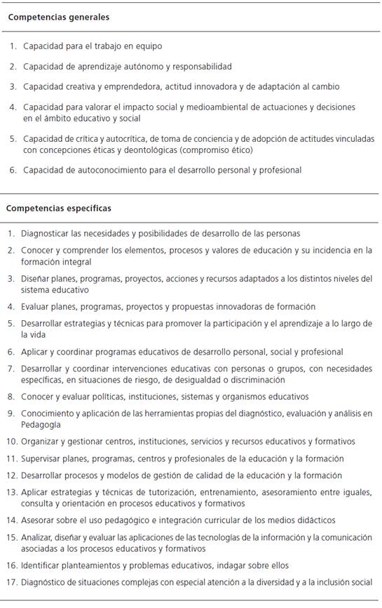 Las competencias planteadas en el plan de estudios del grado de Pedagogía definen un perfil de egresados con capacidad para el análisis, la intervención y el desarrollo de sistemas y procesos educativos en la organización y la administración del propio sistema, en las prácticas de las instituciones escolares y en las diversas agencias de educación no formal, tal como figura en el Real Decreto 915/1992, del 24 de julio, regulador del perfil formativo del pedagogo. Dicho perfil se adecua a las necesidades socioeconómicas actuales, así como al ámbito disciplinario y profesional considerado en el grado, manteniendo su relevancia y vigencia.