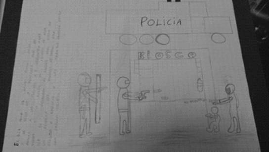 Los estudiantes no son indiferentes a los riesgos que constituyen los ilegalismos y encuentran en la escuela un lugar de resguardo en donde reciben ayuda. Un pedido de ayuda que no expresa en sí aquello que acontece, sino más bien la idea del grito como quien pide auxilio; la escuela deviene ese lugar donde manifestar sus experiencias en torno a situaciones relacionadas con los ilegalismos. Ello tal como lo narra y dibuja uno de los estudiantes (figura 2), allí, se muestra la intervención de uno de los cuerpos de policía de Buenos Aires, denominado Grupo Halcón2 contra las redes de narcotráfico del barrio: