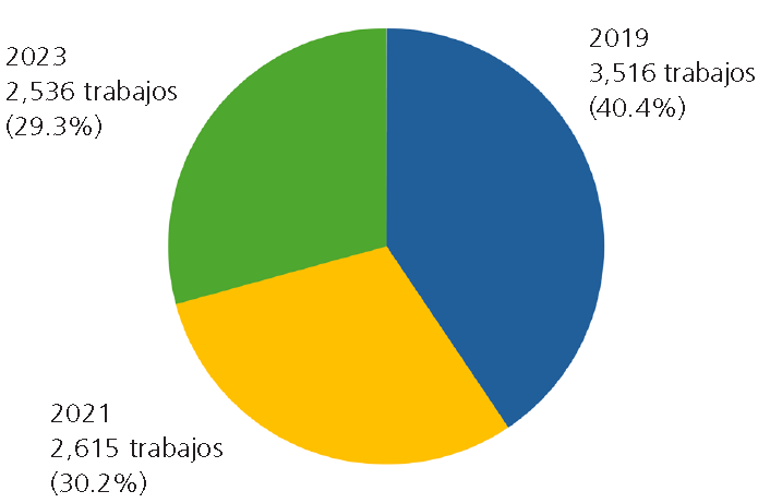 De acuerdo con los tres cortes acotados (ediciones del CNIE) y las fases del trabajo de gabinete, en este primer apartado presentamos un mapeo general de las contribuciones recibidas y aceptadas. En primer lugar, es de destacar que el número de trabajos recibidos en los últimos seis años -ponencias, simposios, libros, material videográfico- ha disminuido de manera notable. No obstante, es preciso subrayar que el XVI CNIE (2021) se llevó a cabo de manera virtual debido al confinamiento sanitario anteriormente mencionado y en el contexto de afectaciones a gran escala no solo en nuestro país sino en todo el mundo, motivo por el cual es comprensible la baja de contribuciones reportadas para ese evento. Es así que en 2019 se recibieron 3,516 trabajos y en 2021, 2,615, es decir, 901 menos que en el año precedente. Sin embargo, llama la atención que en 2023 con 2,536 trabajos registrados, el decremento fue incluso mayor al reportado durante el confinamiento sanitario: 79 trabajos menos que en 2021, y casi mil menos que en 2019. Dado que los congresos de 2019 y 2021 reunieron el 70.6% de los trabajos registrados, este dato demuestra que el de 2023 no logró recuperar las cifras obtenidas en el de 2021, efectuado en modalidad virtual, y mucho menos las correspondientes al de 2019 (Figura 1).
