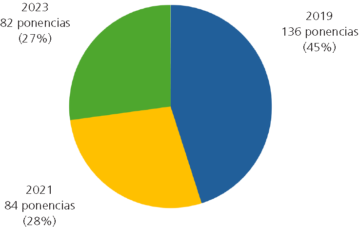 Ahora bien, en el contraste entre todas las modalidades de participación y la correspondiente a la de ponencias en los últimos tres congresos, la cantidad de aceptadas, previa dictaminación, ha oscilado entre un 44 y 50%. Por ejemplo, observamos que para el XV CNIE (2019) se aceptaron 1,559 ponencias, mismas que representaron el 44.34% del total de contribuciones aceptadas. En contraste, en el XVI (2021) solamente se admitieron 1,162 ponencias, con un porcentaje similar al del congreso precedente (44.43%), mientras que en el XVII (de 2023) la aceptación de 1,252 ponencias estuvo muy cerca de llegar al 50% del total de trabajos presentados (Tabla 2).