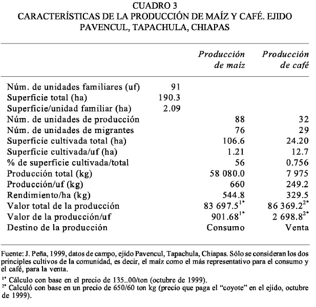 Los indígenas mames son campesinos que cultivan y viven de la tierra para subsistir, por ello, consideramos necesario analizar las características de la producción de maíz y café (cuadro 3), que son los dos principales cultivos de la comunidad; el primero para el consumo y el segundo para la venta. En el caso del maíz, el tamaño de la parcela y sus rendimientos productivos sólo permiten cubrir el consumo familiar entre 4 y 6 meses, situación frecuente en la mayoría de las unidades familiares:"... cosechamos en febrero pero aquí en mayo, junio o julio ya no tenemos maíz, ahí compradito apenas, si a veces ni maíz hay, tenemos que comprar maseca." (Carmen, 50 años, 6 hijos, barrio Carrizal, julio de 1999).