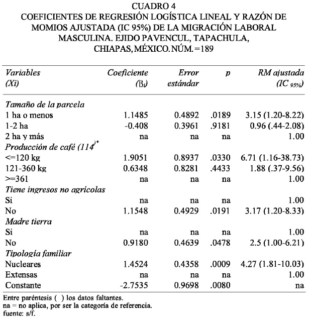 Donde X1 = (Xi1 Xi2,..., Xik) que representó cada uno de los factores que potencialmente explicaban a la migración laboral temporal. Finalmente, los datos nos dieron evidencia estadística £ que la migración laboral temporal entre los indígenas mames se puede explicar a partir de la interacción de algunos factores estructurales y de la organización social que se mostraron en el cuadro 4 y que a continuación mostramos: