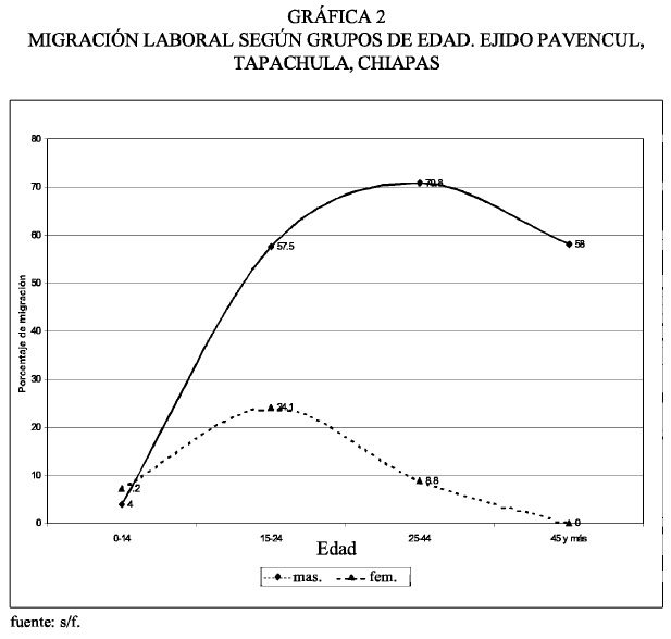 Encontrar que la migración laboral temporal se registro en 87 por ciento de las unidades familiares que se encuestaron muestra la importancia que tiene esta práctica entre los indígenas mames de la Sierra Madre de Chiapas; además, previamente se encontró en el censo comunitario que el 40.2 por ciento de las unidades familiares contaban con un migrante. La migración laboral temporal en el ejido Pavencul es un reflejo de la polarización de las condiciones en el desarrollo regional, ya que el Soconusco constituye en la actualidad la región económica más importante del estado de Chiapas. Al no encontrar las condiciones adecuadas de empleo y salario, los indígenas mames de la sierra han tenido que salir a trabajar a lugares cada vez más lejanos para poder sobrevivir, es decir, que la migración representa una estrategia de sobrevivencia, que surge como respuesta a las condiciones del entorno rural, así como a las características de la unidad de producción doméstica que no alcanza a cubrir sus propias necesidades de consumo, ni a garantizar la reproducción socioeconómica de las unidades familiares en su conjunto ya que, según Villasmil, (1998), en ellas se gestan los mecanismos de producción y reproducción intergeneracional, y son donde se decide la participación económica familiar en actividades agrícolas y no agrícolas como componente esencial de dichas estrategias.