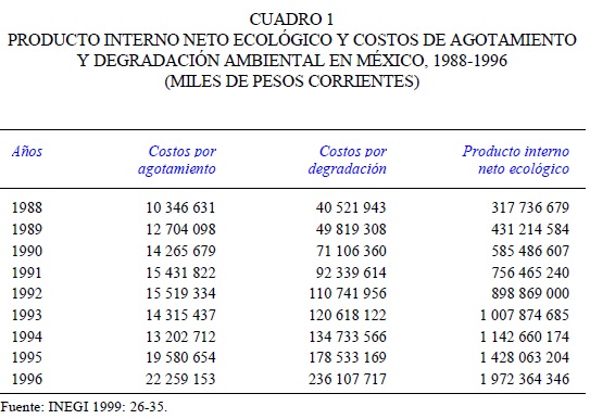 8 Por costo de agotamiento se entiende a las estimaciones monetarias que expresan el desgaste o pérdida de los recursos naturales equivalentes a una depreciación; los costos de degradación son las estimaciones monetarias requeridas para restaurar el deterioro del ambiente, ocasionado por las actividades económicas; el producto interno neto ecológico es la producción interna neta del país a la que se le restan los costos de agotamiento y degradación ambiental (INEGI, 1999: 10).