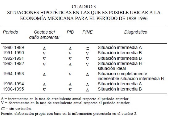 El cuadro 3 se elaboró comparando las tasas de crecimiento anual de las variables PIB, PINE y los costos del daño ambiental (que son la suma de los costos por agotamiento y degradación) respecto al año anterior; así, se colocó un "Δ" cuando se presentó un aumento en la tasa de crecimiento anual, un "∇" cuando la tasa disminuyó en relación con el año anterior y un "⊂" cuando prácticamente se mantuvo inalterada y se definieron las situaciones para cada año de referencia; de esta manera observamos que la economía mexicana se encuentra en las situaciones "intermedia A" e "intermedia B" para el periodo de 1989-1996. Las excepciones son los años de 1993 y 1994, donde existe un rango de incertidumbre para clasificar el comportamiento de las variables; por ejemplo, para el periodo de 1992-1993 las tasas de crecimiento anual de los costos del daño ambiental y las registradas por el PIB podrían hacernos pensar que estamos en una "situación ideal u óptima" y esperar, por consiguiente, que el PINE observara un crecimiento mayor al que registró en el año anterior; sin embargo, éste registró su nivel más bajo del periodo de 1989-1996, lo que nos hace también clasificarlo en una "situación intermedia B".