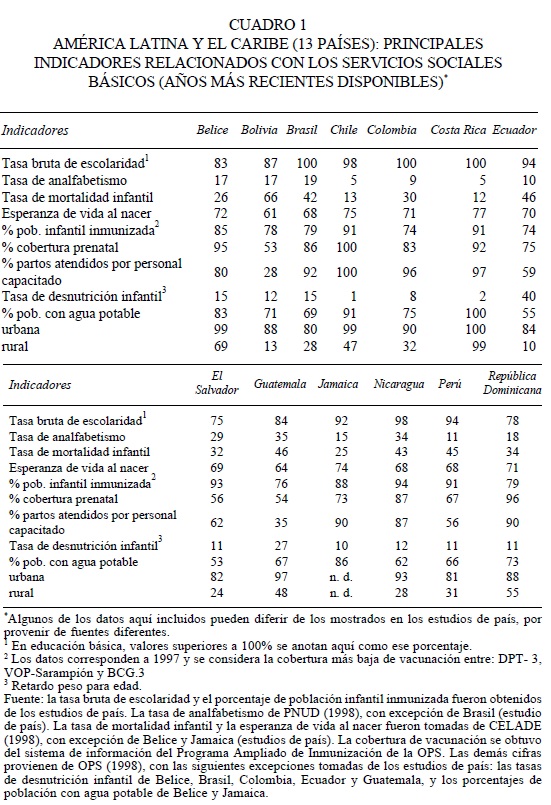 Se realizan a continuación, a modo de introducción, algunas consideraciones sobre la situación de los servicios sociales básicos en los países incluidos en el estudio, el grado de satisfacción de las necesidades en ellos y, en un sentido más amplio, sobre su grado de desarrollo social. Así, en materia de servicios sociales básicos, los indicadores de situación, cobertura, impacto y equidad relacionados con estos servicios reflejan diferentes realidades en los países, pero, en términos regionales, aún no se logra la cobertura universal y prevalecen fuertes iniquidades en su prestación, con menor acceso, e inclusive exclusión, para algunos grupos de población o regiones geográficas. Como lo reflejan las cifras del cuadro 1, la cobertura de la educación básica está muy alejada del 100 por ciento en muchos de los países; las tasas de mortalidad infantil, resultado de las acciones actuales y pasadas en materia de salud, son aún muy elevadas; altos porcentajes de niños no logran completar su cuadro básico de inmunización, con el consecuente impacto en la morbi-mortalidad; subsisten altas tasas de desnutrición infantil, que afectan no sólo la salud de los niños, sino también su capacidad de aprendizaje y sus procesos de socialización, limitando sus posibilidades de desarrollo, y elevados porcentajes de población, especialmente habitantes de las zonas rurales de los países no tienen acceso a servicios de agua potable.