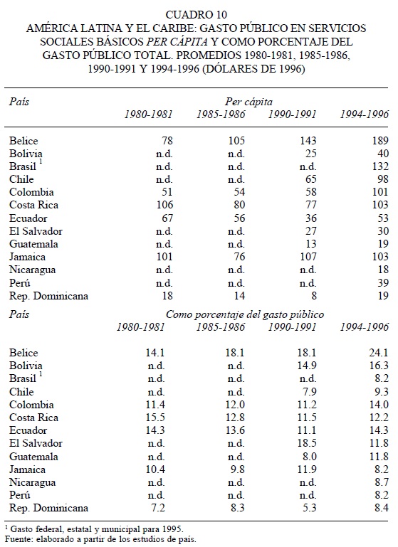 A diferencia del gasto público social total, las series de gasto público en servicios sociales básicos estimadas en los estudios de país no son tan extensas, aunque permiten conocer sobre su evolución. Así, hay una caída en el gasto per cápita hacia mediados de la década de los años ochenta, pero no es tan marcada como en el caso del gasto total, y se da en tres de los seis países con información para todo el periodo. Luego, la mayoría de los países muestran aumentos en este gasto en términos per cápita entre 1990-1991 y 1994-1996, en 8 de 10 países, en estos últimos años se alcanzan los mayores niveles del periodo (cuadro 10). Belice y Colombia, al igual que con el gasto social total, aparecen nuevamente con los mayores incrementos en el gasto per cápita en este tipo de servicios durante el periodo.