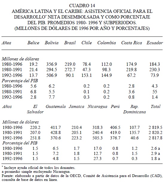 Dado que cualquier periodización resulta en este caso arbitraria, se ha optado por analizar los flujos de ODA durante los años ochenta y los primeros años de la década de los noventa en que continuaron creciendo, y los siguientes años de la década para la que se dispuso de información (1992-1996). Así, para los 13 países en su conjunto, los desembolsos de ODA, medidos como promedios anuales para esos subperiodos, muestran un estancamiento en términos de magnitud, según se desprende de los datos del cuadro 14.