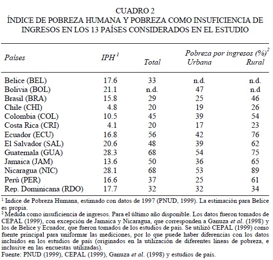 El Indice de Pobreza Humana (IPH), estimado por el Programa de las Naciones Unidas para el Desarrollo (PNUD), aproxima el fenómeno de la pobreza por el lado de las necesidades básicas insatisfechas (NBI), como resultado de la falta de acceso y problemas de calidad de los servicios sociales básicos,2 por lo que constituye un excelente indicador resumen para el presente. Los 13 países incluidos en este estudio muestran situaciones disímiles respecto a este indicador: dos con niveles de pobreza inferiores a 10 por ciento, siete con niveles entre 10 y 20 por ciento, y los cuatro restantes con niveles superiores a 20 por ciento (cuadro 2). Tomando en cuenta la población, de los 301 millones de habitantes en estos 13 países,3 46.4 millones, o sea, 15.4 por ciento, se encuentran en situación de pobreza según este enfoque.4