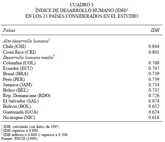 Finalmente, se hace referencia a la otra cara del fenómeno, o sea, el grado de desarrollo social de los países considerados, medido en este caso por el Índice de Desarrollo Humano (IDH), que toma en cuenta el impacto positivo del acceso efectivo a los servicios sociales (más allá de problemas de calidad en los mismos), junto con las posibilidades de llevar una vida digna que proporciona el ingreso.10 Según el IDH publicado en 1999, pero estimado con datos de 1997 (PNUD, 1999), solamente dos de los países presentan un desarrollo humano alto, mientras que los 11 restantes, un desarrollo medio (cuadro 3). A su vez, dentro de estos últimos países hay diferencias importantes en el grado de desarrollo humano, pues los índices asumen valores en casi todo el rango de la categoría, repitiéndose nuevamente esa fuerte desigualdad entre países que caracteriza ya no sólo a los 13 aquí considerados, sino que a todos los que conforman la región latinoamericana y caribeña.