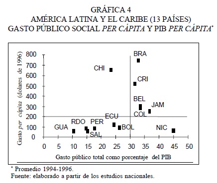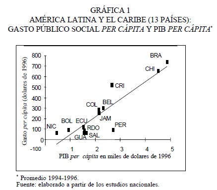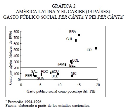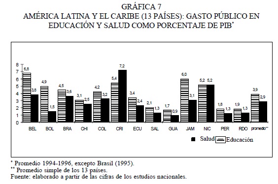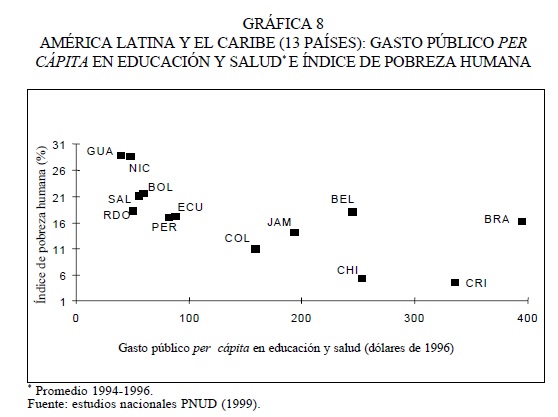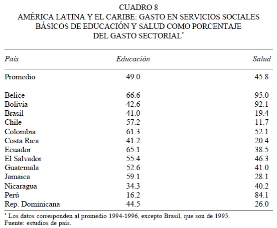 38 Sobre esto último, Birdsall et al. (1998: 43), refiriéndose a la baja y desigual acumulación de capital humano en América Latina, han llegado a señalar que el problema básico no es el de un bajo nivel de gasto en salud y educación el que es similar al de otras regiones en desarrollo, con 6.6 por ciento del PIB, sino más bien de utilización ineficiente del gasto público y de distribución poco equitativa de la incidencia del gasto en esos servicios, es decir, la proporción relativamente baja de ese gasto que ha beneficiado a los pobres.