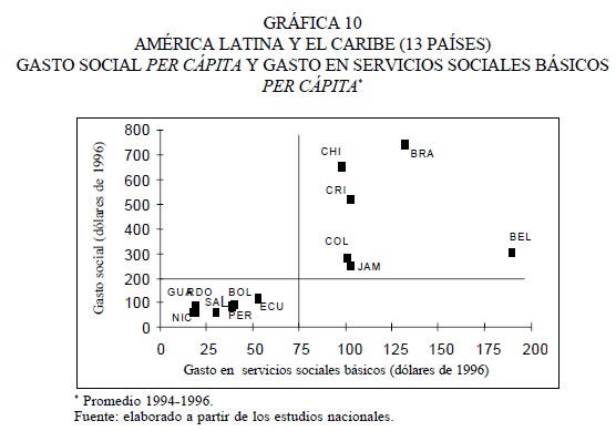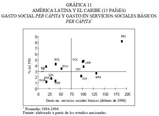 Como porcentaje del PIB, los 13 países destinaron, en promedio, 3.4 por ciento del PIB a los servicios sociales básicos, con diferencias por países (cuadro 9 y gráfica 11), pues mientras la tendencia general refleja una relación directa entre ambas magnitudes, por una parte Nicaragua, Bolivia y Ecuador muestran mayor prioridad macroeconómica para su (bajo) nivel de gasto y, por la otra, Chile y Brasil, menor prioridad para su (elevado) nivel de gasto.