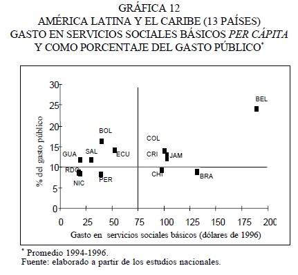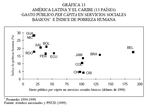 En la gráfica 13 se muestra la relación entre el nivel de gasto público en servicios sociales básicos y el nivel de pobreza medido por el Índice de Pobreza Humana. Se distinguen claramente tres grupos de países: un primer gran grupo que incluye los países con bajos niveles de gasto per cápita y elevados niveles de pobreza; un segundo grupo con niveles medios y altos de gasto per cápita y niveles bajos y medios de pobreza, y Belice, que presenta el gasto más elevado pero con un nivel medio de pobreza.
