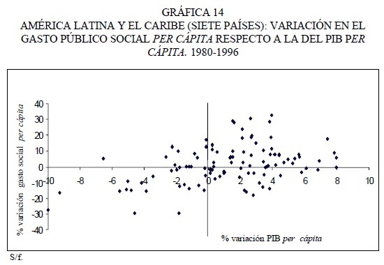 Como se desprende de los estudios de país y de diversos estudios de carácter regional, la década de los noventa, en general, especialmente los últimos años de estudio (1994-1996), han sido para América Latina y el Caribe, desde el punto de vista económico, mejores años que los anteriores, mostrando entre los principales logros: crecimiento económico, baja inflación y, en algunos países, reducción del desempleo. Estos resultados económicos definitivamente ha incidido en el incremento de los gastos sociales, como se mostró en la sección anterior. Ahora bien, desde una perspectiva general, la evolución de los gastos sociales desde la década pasada ponen de manifiesto su carácter procíclico: aumentan cuando hay expansión económica y disminuyen cuando hay recesiones.32