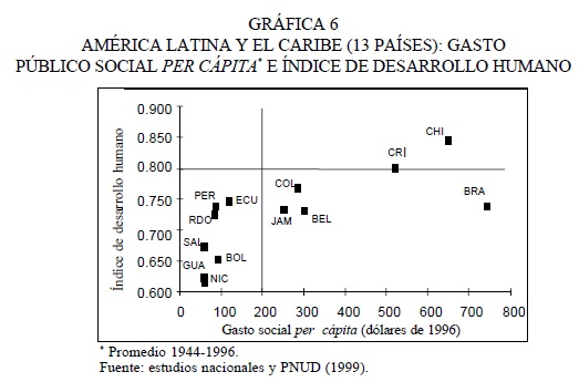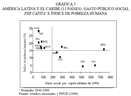 El resultado esperado de mayores niveles de gasto social, con adecuados niveles de eficiencia y calidad, y garantizando la cobertura universal de los servicios sociales básicos, es un menor nivel de pobreza, especialmente por NBI, y un mayor nivel de desarrollo humano. Cuando se relaciona gasto público social con pobreza, en este caso medida por el Índice de Pobreza Humana (IPH), aparecen claramente tres grupos de países (gráfica 5): los países de menor gasto social, con elevados niveles de pobreza; los países de gasto social medio, con niveles también medios de pobreza, y los países de alto gasto social, con menores niveles de pobreza, aunque entre estos últimos Brasil aparece como un caso diferente, con un mayor nivel de pobreza. Si tenemos presente la dimensión temporal 26 y dejando de lado diferencias en la eficiencia del gasto,27 los resultados generales sugieren la relación inversa entre nivel de gasto social y pobreza y, por lo tanto, la importancia de este tipo de gastos para el alivio de la pobreza.