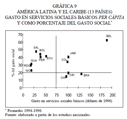 Considerando los servicios sociales básicos en su totalidad, el gasto público en ellos representó, en promedio, 34.4 por ciento del gasto público social total, o sea, que uno de cada tres dólares gastados por los gobiernos en servicios sociales correspondió a servicios básicos (cuadro 9 y gráfica 9). Hay diferencias por países, y como cabía esperar, el porcentaje que representa el gasto en estos servicios dentro del gasto social total es mayor en los países que efectúan un menor gasto social (especialmente Bolivia, Ecuador, El Salvador y Perú), y también entre los que tienen sectores sociales poco desarrollados, a pesar de que gastan más (Belice y Jamaica).
