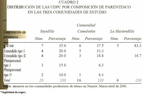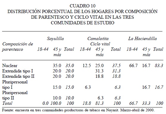 En el caso particular de nuestra investigación, se encontró que la comunidad de mayor tamaño (Sayulilla) es también la más cercana a los principales centros urbanos de la zona,7 donde las posibilidades de las familias productoras de tabaco en esta comunidad para diversificar sus actividades económicas, y por ello las posibles estrategias de sobrevivencia del grupo doméstico, son también más grandes.