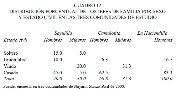 Los jefes de los hogares en las comunidades que conforman nuestro estudio, de acuerdo con su estado civil, están distribuidos de la siguiente manera: en Sayulilla 50 por ciento de los jefes son casados (45 por ciento son hombres y 5 por ciento mujeres), 20 por ciento se constituye por mujeres viudas, 10 por ciento vive en unión libre y el restante 20 por ciento son jefes solteros (tres hombres y una mujer). En Camalotita no hay jefes solteros, y la mayor proporción de los jefes son casados (62.5 por ciento) y todos son hombres. Solamente 6.3 por ciento vive en unión libre y también hay una alta proporción de viudas que son jefas de hogar (31.3 por ciento).