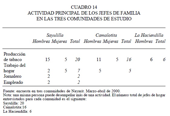 Anteriormente, cuando veíamos la composición de los hogares, se observó que en Sayulilla las familias eran más complejas; ahora, puede verse que además de complejas, en esta comunidad las familias son también más dinámicas que en Camalotita y La Haciendilla, en lo que se refiere a la ocupación de los jefes y jefas de hogar. En el cuadro 14 se puede ver como en Sayulilla existe una mayor diversificación en las actividades de los jefes de hogar; mientras que en las otras dos comunidades, aquéllos sólo se dedican a la actividad agrícola.