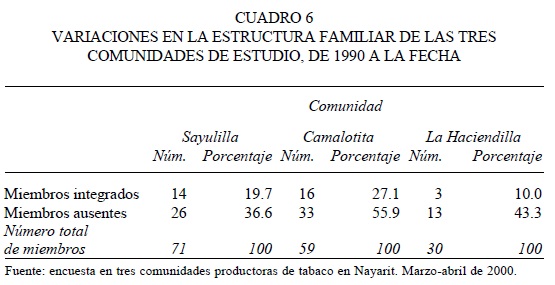 La estructura y tamaño de los hogares en estas comunidades ha variado desde 1990 a la fecha,6 pues mientras algunos miembros se integraron al grupo doméstico a partir de dicho año; otros se han ausentado del mismo, aunque en las tres comunidades es mayor el número de miembros que se han alejado de sus hogares (cuadro 6). Entre las principales causas de agregación de nuevos miembros al grupo doméstico se encuentran el matrimonio y el nacimiento. Por otra parte, el matrimonio, los estudios, la migración interna e internacional, y el fallecimiento, constituyen las principales razones de ausencia de miembros del grupo doméstico.