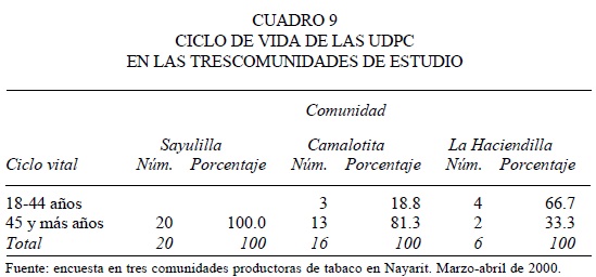 En Sayulilla, el total de las UDPC se encuentran dentro de un ciclo de vida avanzado. También entre las familias de Camalotita existe una mayor proporción de las de ciclo avanzado (81.3 por ciento), contra 18.8 por ciento de familias de ciclo joven. En cambio, en La Haciendilla predominan las familias de ciclo joven (66.7 por ciento) y sólo 33 por ciento corresponde a familias de ciclo avanzado (cuadro 9).