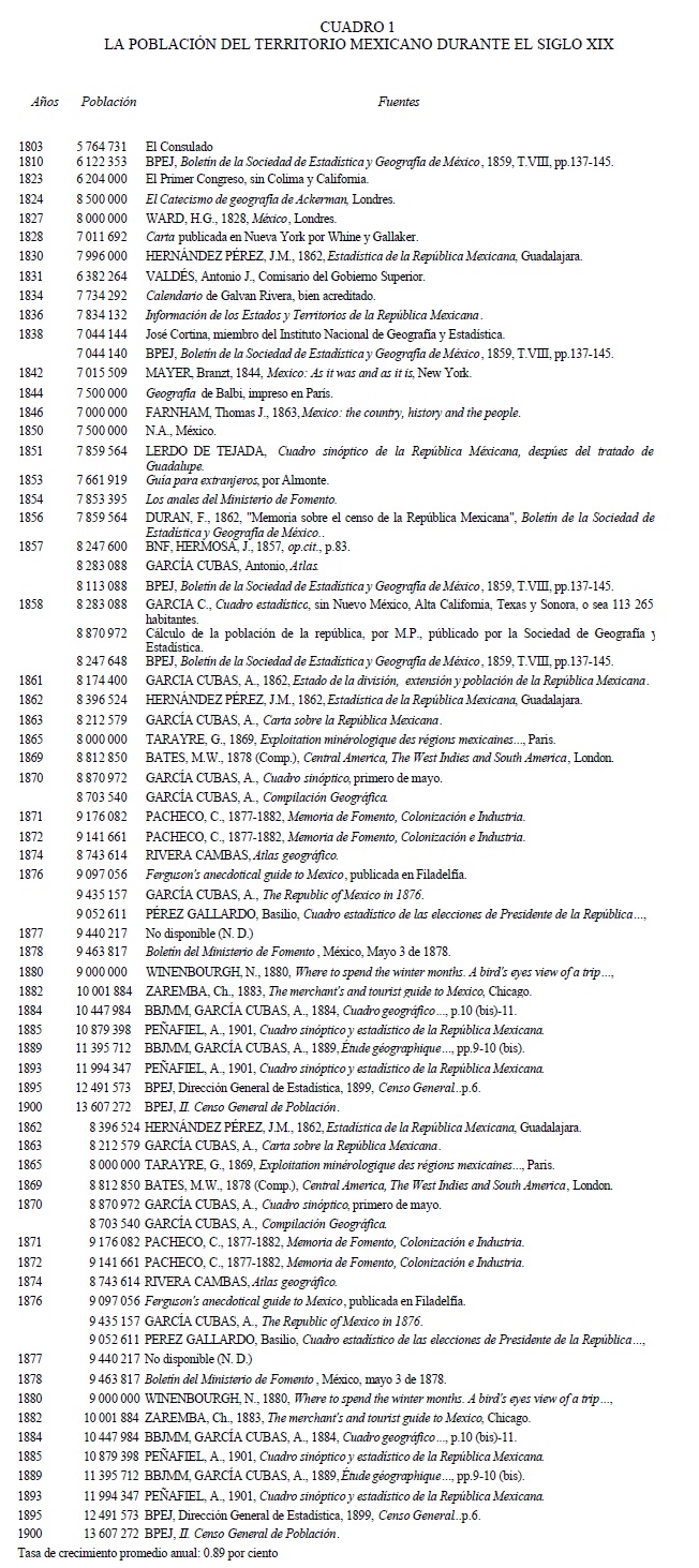 tenerse en cuenta las circunstancias que influyen en un desarrollo lento: 1° La población que perdimos con la cesión de los Estados de Nuevo México, Tejas, Alta California y parte de Tamaulipas, Chihuahua y Coahuila, 2° la que nos arrebató la guerra de independencia, 3° la de los norteamericanos, 4° nuestras odiosas guerras intestinas, 5° la guerra de castas en ... Yucatán, 6° las de los bárbaros que [han] azotado los Estados fronterizos del Norte, según se ha manifestado en el Atlas, 7° la disminución notable que experimenta la raza indígena ... 8° las tres invasiones del cólera, y por último, las grandes enfermedades endémicas de las costas (García, 1859: 115).