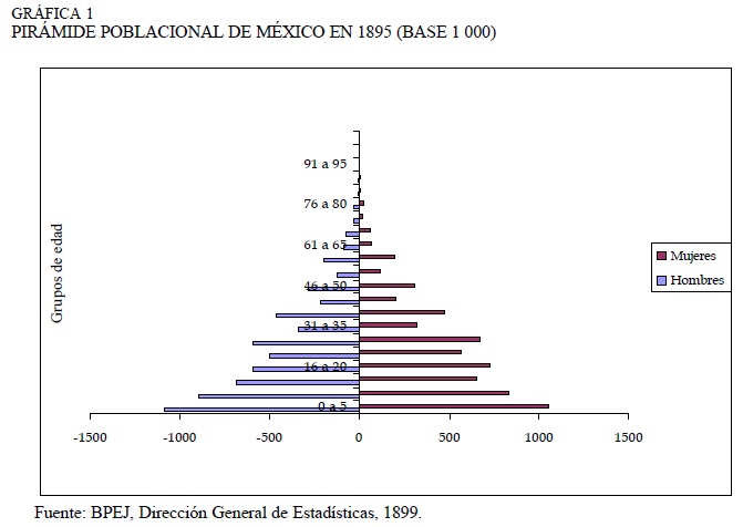 Para finalizar presentaremos algunos cálculos sobre el comportamiento demográfico; en trabajos posteriores profundizaremos en el análisis. De acuerdo con las cifras recopiladas en el cuadro 1 el crecimiento demográfico en el territorio mexicano durante el siglo XIX (que incluye algunos años de la colonia) se ratifica. Sin embargo, no se presentó de forma regular a través del tiempo, hubo estados donde dicho movimiento fue más intenso. De 1803 a 1900 la población creció a una tasa promedio anual de 0.89 por ciento, si consideramos el primer año que se obtuvieron cifras del periodo nacional, entonces este ritmo fue de 1.03 por ciento.17 En 1895, en la estructura demográfica del país se evidenciaban las irregularidades de años anteriores, los comportamientos del ritmo de crecimiento promedio anual y la tendencia del crecimiento absoluto, se deben fundamentalmente a las cifras, algunas de ellas levantan serias sospechas. No descartamos que efectivamente esa discontinuidad en menor intensidad se haya presentado durante el siglo XIX, como la ratifica la pirámide de población total de México en 1895 (gráfica 1). Si calculamos la misma tasa para los últimos 15 años del siglo XIX, este ritmo de crecimiento se aceleró: 1.5 por ciento promedio anual. Sin embargo, creemos que Kicza exagera cuando dice que se duplica, aún si se consideraran los siguientes 10 años. Pero insistimos, un análisis más detallado necesariamente debe incluir la dinámica demográfica de las principales ciudades mexicanas del siglo XIX, debido a que creemos que los problemas de crecimiento demográfico en México, manifestados en el proceso de subdesarrollo, corresponden única y exclusivamente al siglo XX. Asimismo, es importante poner en relieve las funciones de las áreas urbanas en México dentro del proceso de industrialización.