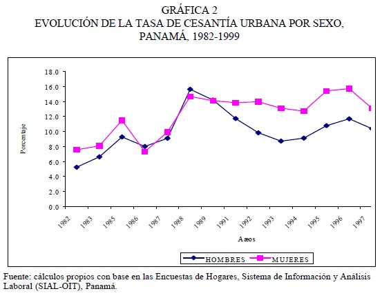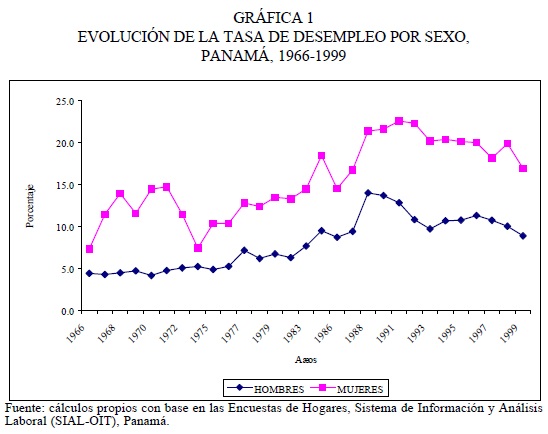 Quizá los factores que más claramente distinguen la dinámica del mercado laboral urbano en Panamá sean, por un lado, la intensa participación femenina, y, por otro, el alto desempleo estructural, que por largas décadas ha afectado mayormente a las mujeres. En cuanto al aumento de la fuerza de trabajo femenina, es notoria la tendencia hacia un patrón convergente, relativamente estable y más homogéneo en la composición por sexo del mercado de trabajo. La participación de la mujer ha aumentado en sí misma y también en comparación con la del hombre. No obstante, en parte consecuencia del mismo proceso, la tendencia del desempleo femenino ha sido marcadamente superior a la experimentada por la PEA masculina. La participación femenina y su incidencia sobre la oferta total de la mano de obra ha contribuido a incrementar el desempleo.