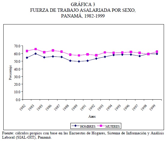 Durante más de cuatro décadas, pero especialmente desde mediados de los años sesenta, Panamá experimentó un proceso sostenido de feminización de la fuerza de trabajo. La PEA femenina se ha más que cuatriplicado, al pasar de alrededor de 9.6 a 38.9 mil trabajadoras entre 1966 y 1999, periodo en el que la PEA masculina apenas creció 2.5 veces. En dicho periodo la tasa de participación femenina se incrementó de 28.4 a 43.2 por ciento, en contraste con la masculina, que cayó de 86.3 a 79.7 por ciento, lo que significó una reducción de 21.4 por ciento en la brecha que separaba la actividad femenina de la masculina tres décadas atrás. El cambio fue importante en términos relativos, y fue aún más acentuado en el mercado laboral urbano. En el periodo 1982-1999 el crecimiento promedio de la fuerza de trabajo femenina urbana superó ampliamente a la masculina. Durante las casi dos décadas, mientras que la tasa de actividad masculina creció 10.9 por ciento, la femenina lo hizo 28.9 por ciento, al pasar de una tasa de participación de 39 a 50.2 por ciento, alcanzando a representar, en 1999, 40.5 por ciento de la fuerza de trabajo urbana.