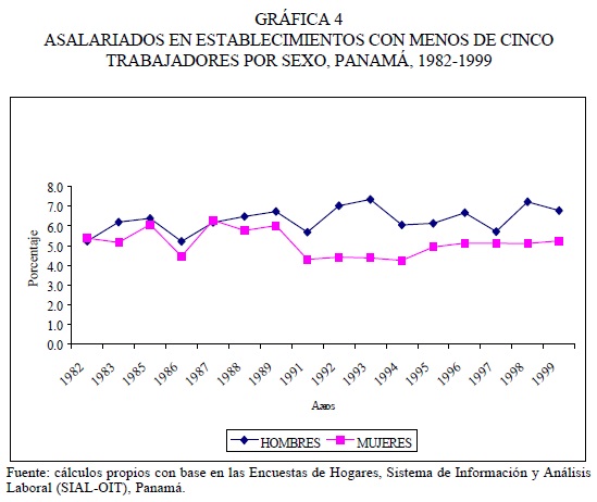 En Panamá el trabajo urbano de tiempo parcial involuntario creció de 2.9 por ciento del total de ocupados urbanos en 1982 a 9.9 por ciento en 1988 y, con un ligero descenso, representaba 7.4 por ciento en 1999. En términos de la participación por sexo, ha seguido una tendencia similar. No obstante, muy recientemente afectó m ás a los hombres que a las mujeres. Creció de 3.3 a 10.6 y de 2.3 a 8.8 por ciento entre 1982 y 1988, entre la ocupación urbana masculina y femenina, pero hacia el final de la década pasada, el deterioro fue mayor para las mujeres, al alcanzar 6.3 por ciento entre los hombres y 8.8 entre las mujeres.