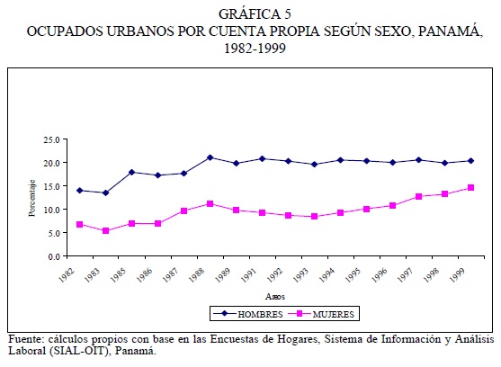 La tendencia general ha sido aumentar la participación de los trabajadores por cuenta propia, ante la disminución y/o estancamiento del empleo asalariado, público y privado. Pero, cómo explicar la presencia mayoritaria de hombres en dichas actividades, laboralmente más vulnerables, teniendo en cuenta que del total de trabajadores urbanos independientes 98 por ciento correspondió, en 1999, al llamado "informal informal". El problema no es nuevo y, por consiguiente, las razones pueden ser las mismas, aparentemente válidas durante la década de los ochenta, asociada con las posibilidades de obtener mayores ingresos. Según Martínez (1992), durante dicho periodo en Panamá "la mediana de ingresos de los trabajadores por cuenta propia, creció en términos reales por encima del 20 por ciento durante el período intercensal y superó significativamente la mediana de ingreso de los trabajadores permanentes".