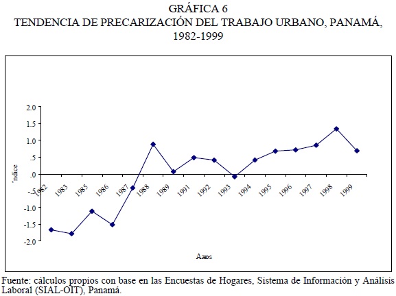 El índice de precarización se estimó a partir del primer factor o componente (K = 1) el cual resume la mayor variación conjunta de las observaciones o matriz de datos, y corresponde a las puntuaciones factoriales para cada año de la serie considerada. Los valores obtenidos se incluyen en la tabla A2 y son representados en la gráfica 6. El valor del índice varía en sentido directo al grado de precarización; es decir, que a mayor valor del índice más desfavorable es la situación ocupacional urbana o viceversa, y está en relación con la situación general o los niveles de precariedad en el periodo analizado. En este sentido, es claramente observable la tendencia de deterioro relativamente creciente en el mercado laboral urbano a lo largo de las dos décadas. Por lo menos son distinguibles cuatro momentos que, en cierto modo, corresponden con la dinámica de estabilidad relativa y deterioro de la economía. La precarización del trabajo urbano en Panamá mantuvo niveles relativamente bajos durante la primera mitad de la década de los ochenta. En este sentido, es medianamente cierto el planteamiento de Gregory (1991) de que en la década de los ochenta no pareció evidenciarse "un deterioro general y profundo en las condiciones de trabajo". Entre 1982 y 1986 la precarización mantuvo niveles relativos bajos (negativos), pero se incrementó sensiblemente a partir de entonces, hasta alcanzar el nivel más alto de la década en 1988, en la cúspide de las crisis económica y política (tabla A2). Con la recuperación económica, a partir de 1989 y comienzos de los años noventa, la precarización tendió nuevamente a bajar, entre 1989 y 1993; no obstante, durante la segunda mitad de la década alcanzó el nivel más alto, experimentado en 1998, y, aunque tendió a reducirse en 1999, la tendencia general es cercana a la peor de la década de los ochenta.
