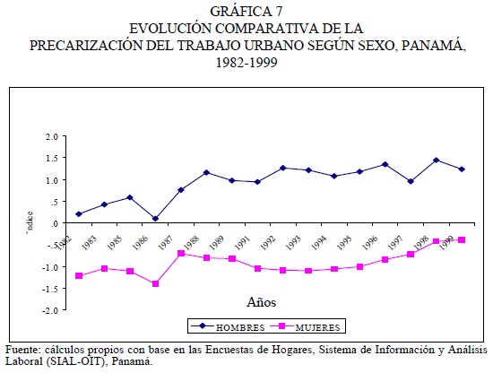 En Panamá, por lo menos desde inicios de la década de los ochenta, coincidiendo con la crisis y las políticas de ajuste y estabilización económica, se observa una creciente precarización del trabajo que, tendencialmente, parece afectar más a los hombres que a las mujeres. El país, en sentido general, no ha estado exento ni está al margen de las tendencias globales. Como en otros contextos, por un lado, la modernización de la economía favoreció la temprana participación económica de la mujer, que pasó a ocupar esferas del mercado de trabajo anteriormente reservadas a los hombres; por otra parte, como en el resto de países de la región, la reestructuración económica ha transformado las estructuras de ocupaciones, ha incrementado el desempleo y ha inducido un creciente deterioro en la calidad del trabajo.