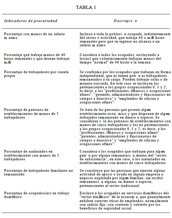 En este caso, con base en algunos indicadores disponibles en la Encuesta de Hogares, se analizan las tendencias y algunas de las características de la precarización de la población ocupada urbana total, masculina y femenina, entre 1982 y 1999. La elaboración de esta medida de precarización del trabajo se hizo con base en siete variables (o indicadores) de mala calidad del empleo (tabla 1).