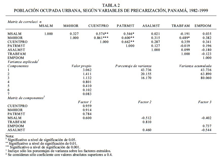 Los resultados obtenidos y la gráficas respectivas para el total de los ocupados urbanos y para los hombres y mujeres corridos conjuntamente muestran las tendencias relativas de precarización del trabajo a lo largo de las dos décadas. Las tablas 1 y 2 presentan un resumen del análisis estadístico: la matriz de correlación, los componentes factoriales y varianza explicada por los componentes extraídos, y, finalmente, los factores y las variables que "saturan" en cada uno de ellos. La correlación entre dichas variables valida la pertinencia del análisis de componentes principales, y carecería de sentido si por lo menos algunas de las variables no estuvieran asociadas linealmente. Al respecto, cuanto mayor sea el número de variables con alta correlación, menos factores explican la mayor parte de la variabilidad total.